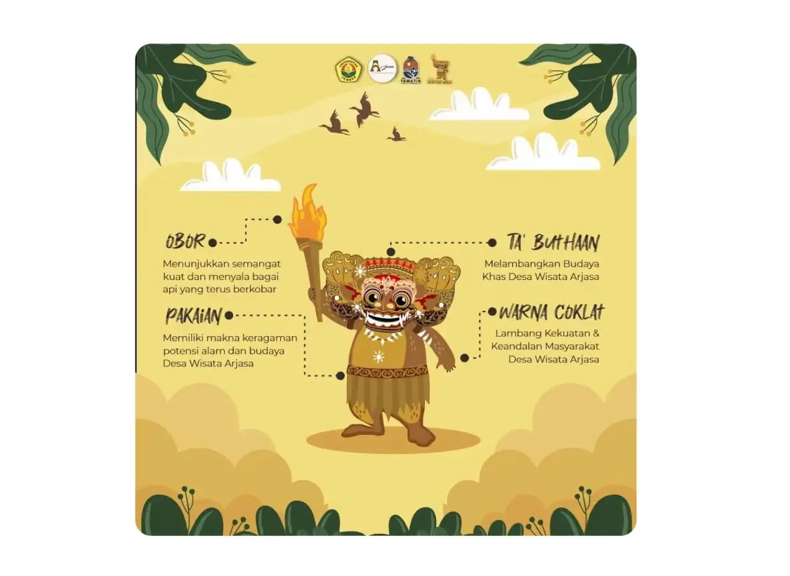 Warna coklat pada maskot ini juga melambangkan kekuatan dan keandalan masyarakat Desa Wisata Arjasa. Warna ini mencerminkan keberanian dan keteguhan hati masyarakat dalam menjaga dan melestarikan budaya mereka.